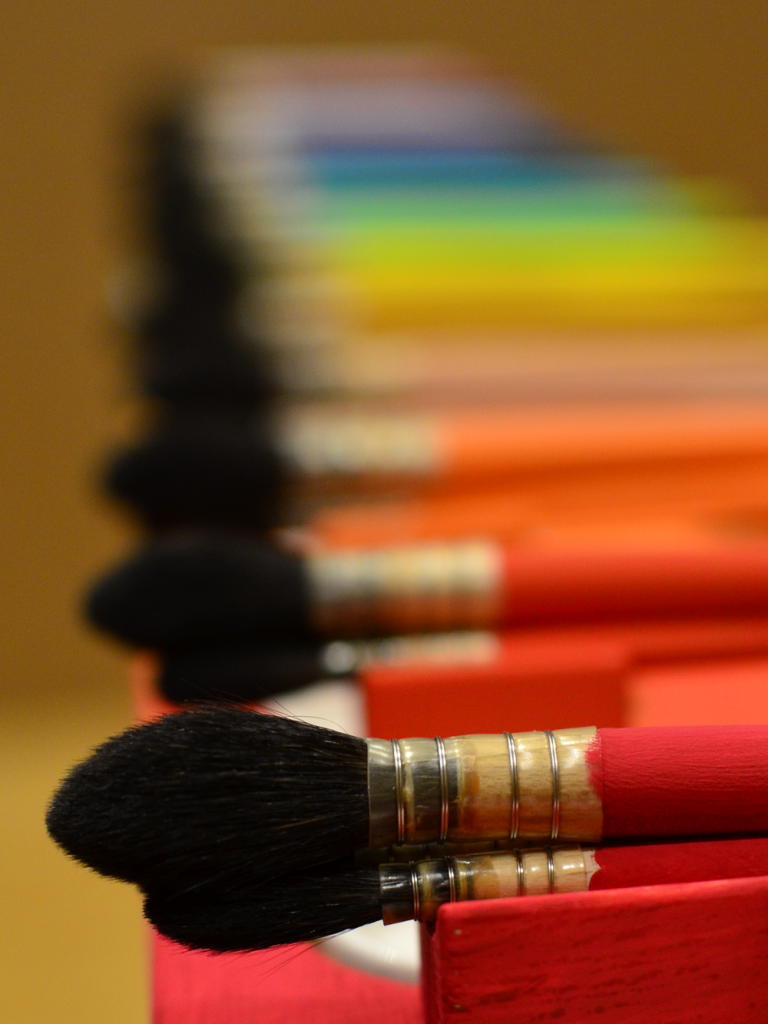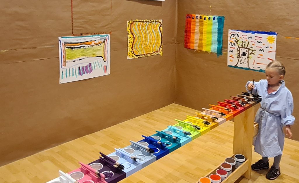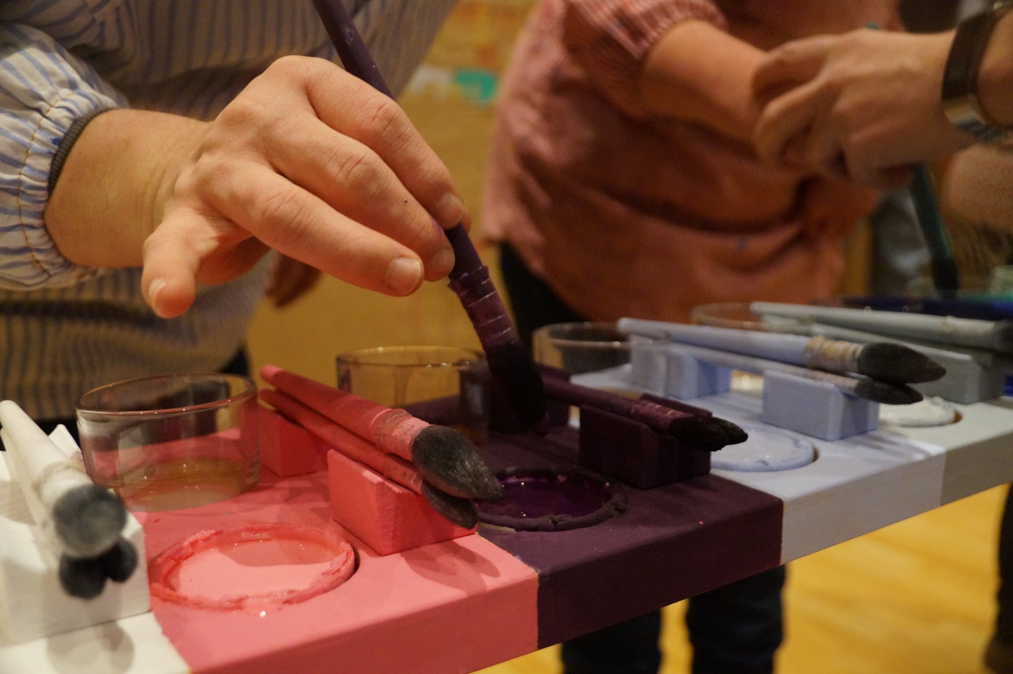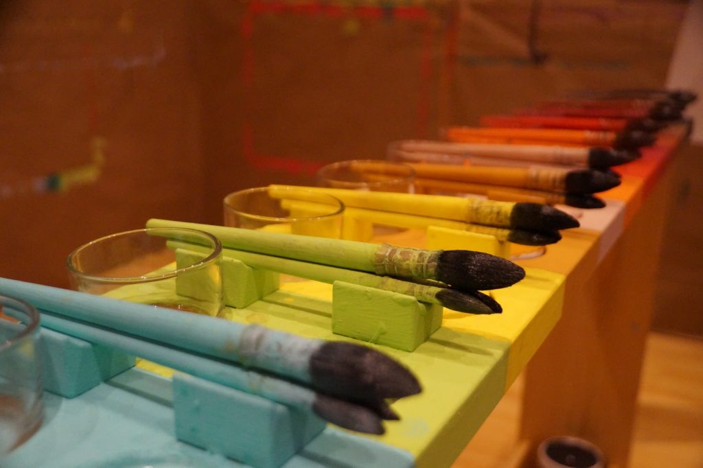 In der Mitte des Raumes befindet sich der Paletten-Tisch mit 18 Farben und jeweils drei Pinsel. Gemalt wird stehend – das Papier ist an der Wand angebracht. So entsteht eine Pendelbewegung zwischen dem Gemeinsamen (Farben, Pinsel, Palettentisch) und dem Individuellen (das Blatt, das jedem einzelnen gehört, seinen eigener Spielraum ist).